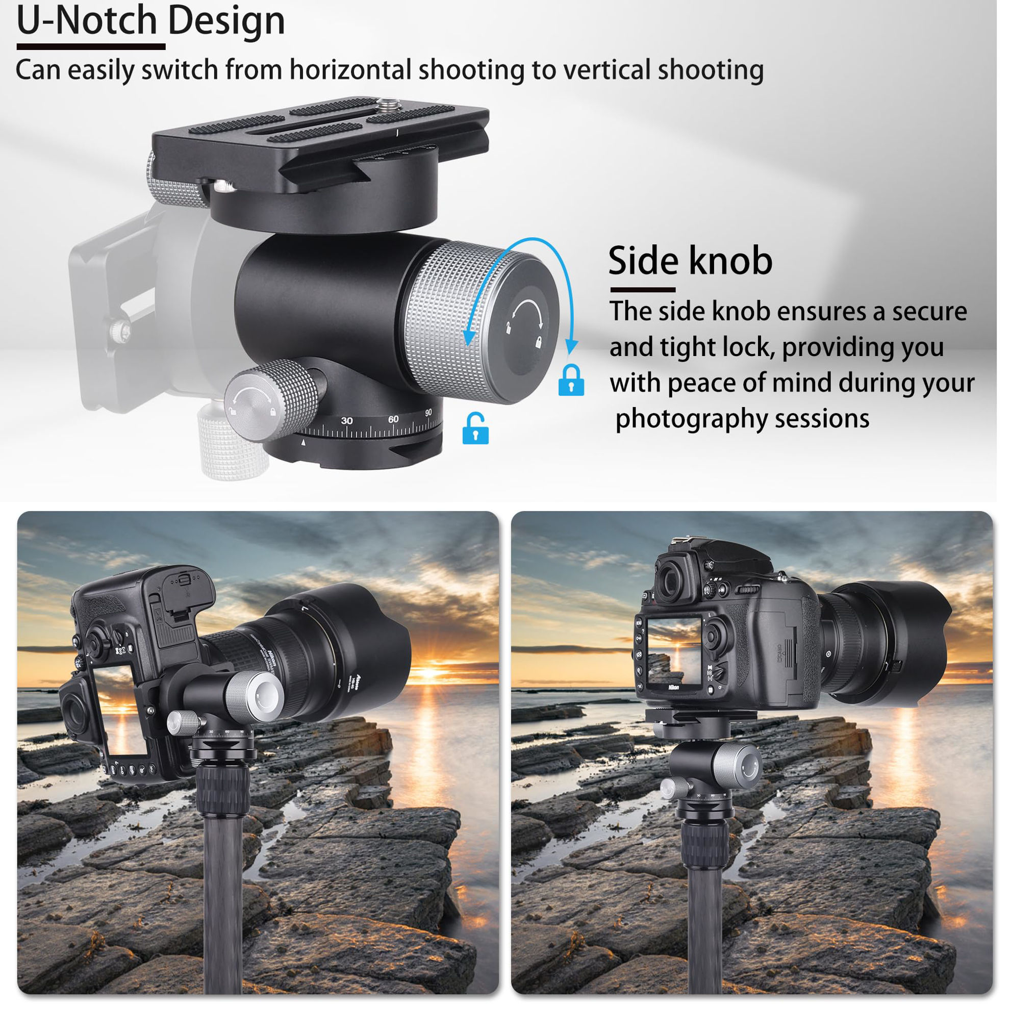 Het gimbal-ontwerp laat je de lens balanceren rond het zwaartepunt, zodat je moeiteloos kunt pannen en kantelen zonder dat de lens naar voren of achteren zakt.