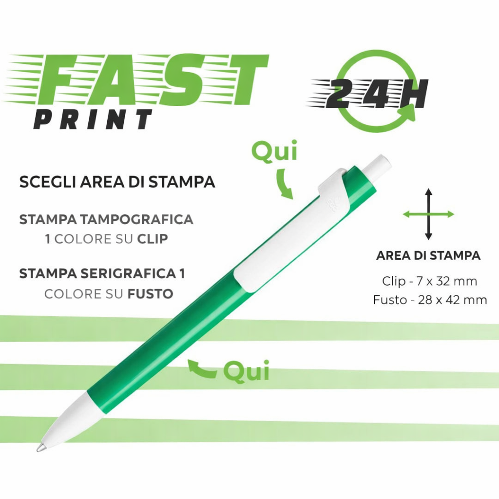 Con il servizio FAST PRINT puoi ordinare fino a 1000 penne entro le 10:00 per spedizione il giorno successivo ( + giorni di consegna), garantendo consegne rapide per le tue attività promozionali urgenti.